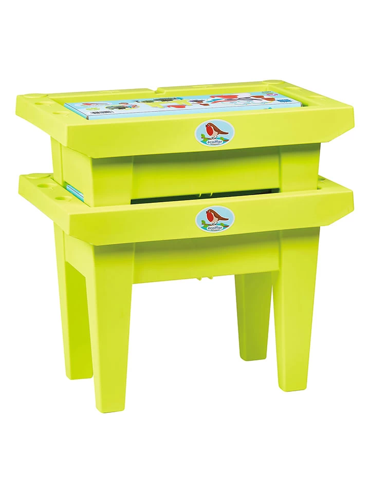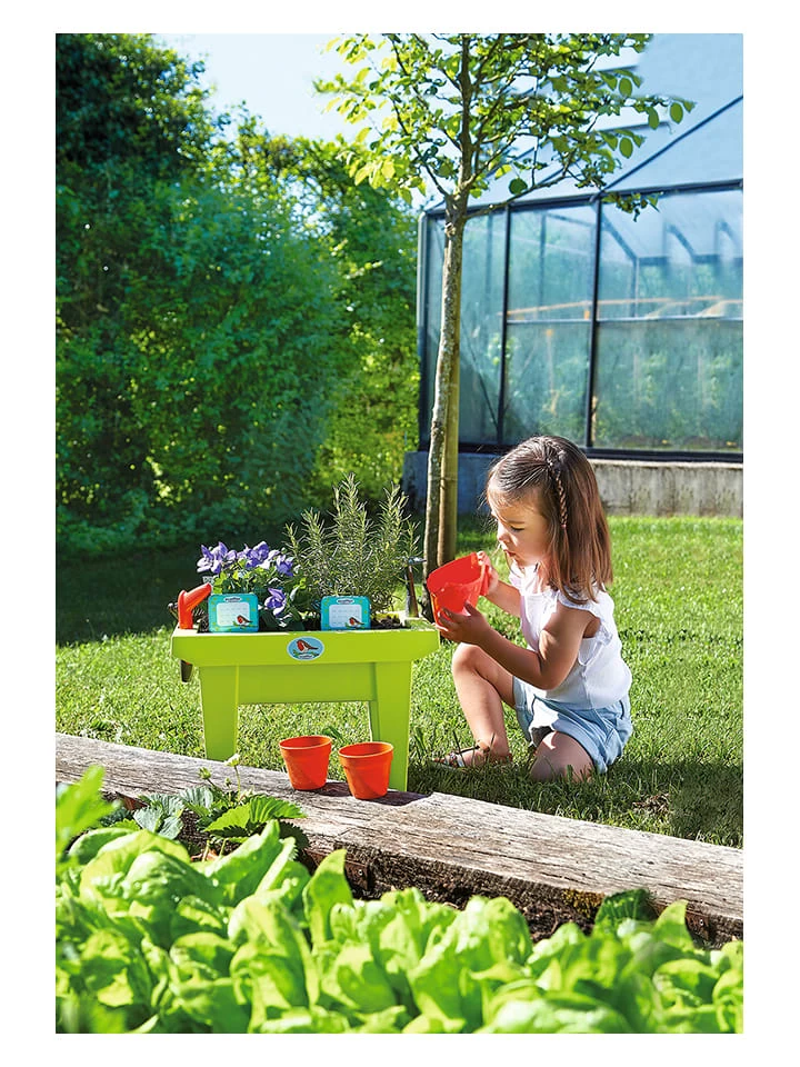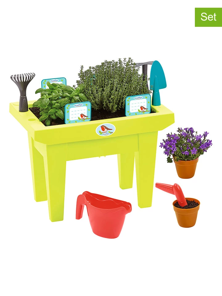 – Inhalt: Hochbeet, Rechen, Schaufel, Hacke, Pflanzer, Gießkanne, 4 Schilder und 2 Blumentöpfe