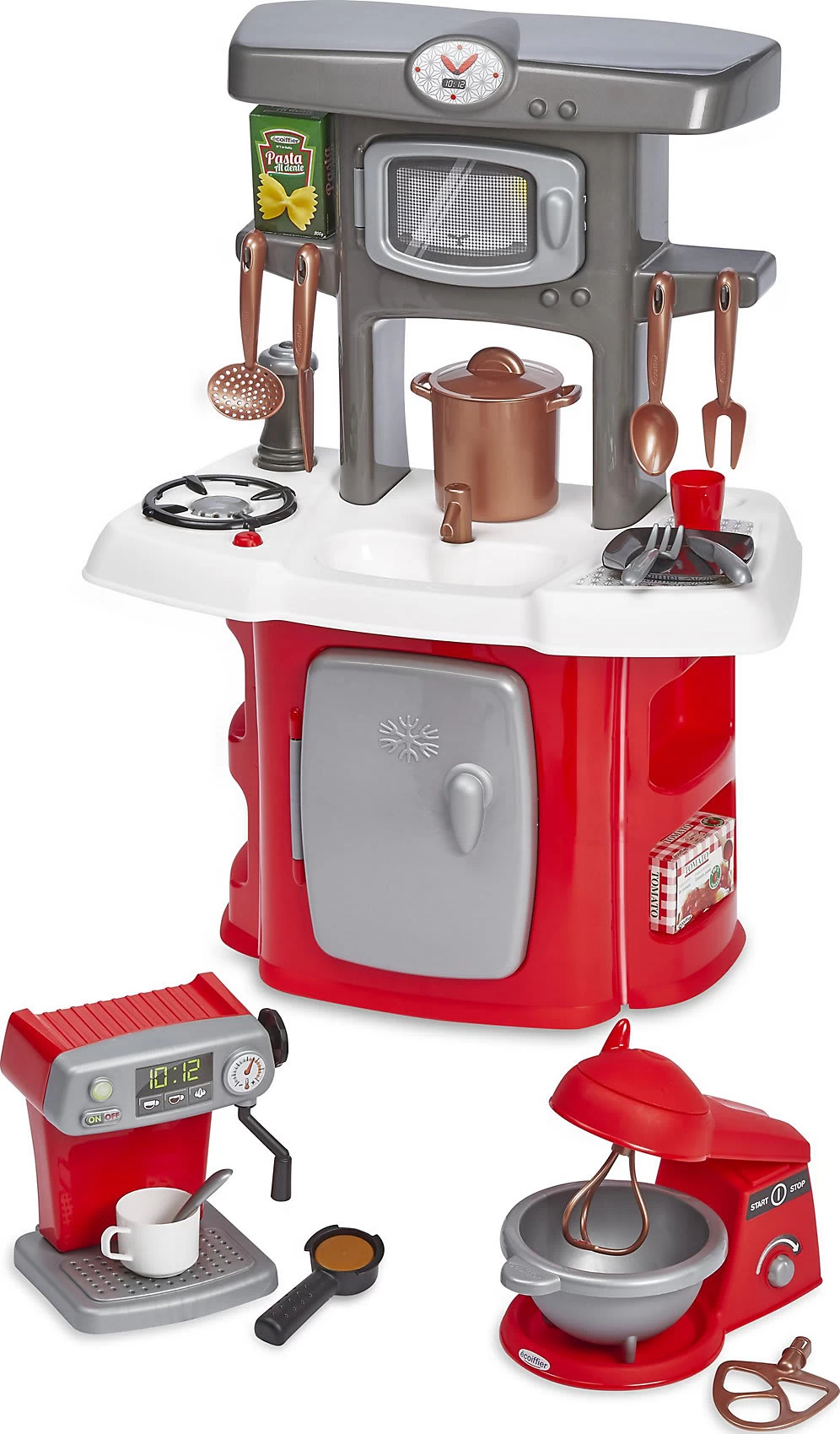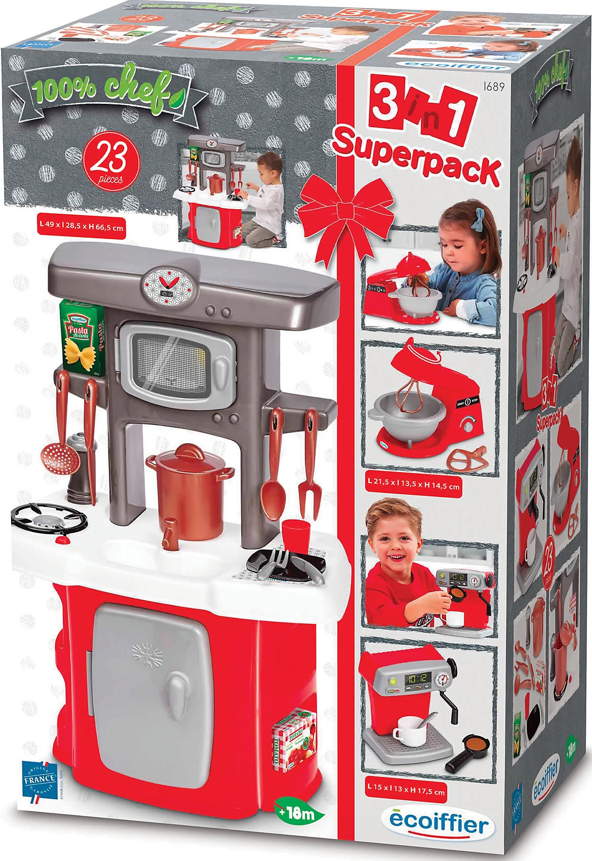 Mit diesem praktischen 3-in-1-Superpack mit Küche, Espressomaschine und Küchenmaschine von écoiffier können kleine Küchenmeister*innen kochen wie die Großen. Das Set umfasst eine Spielküche mit Backofen, Herd und Spüle, eine Küchenmaschine mit Rührschüssel und eine Espressomaschine mit abnehmbarem Siebträger. Das Spielküchen-Superset umfasst insgesamt 23 Teile. Hergestellt in Frankreich.