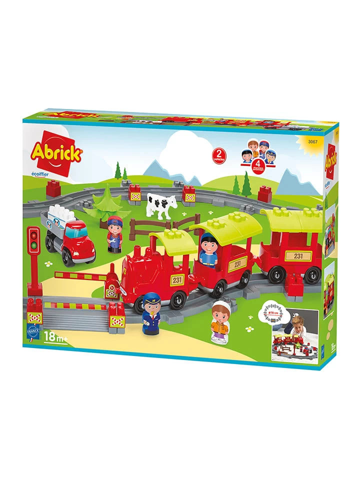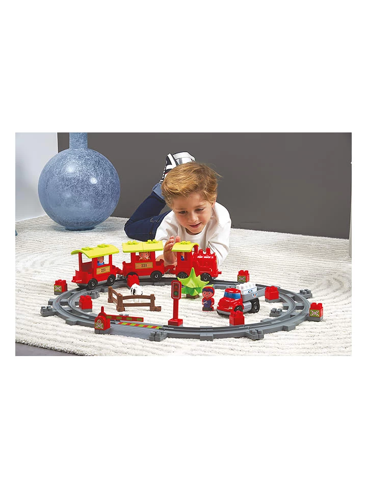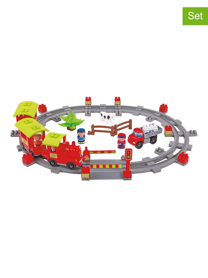 – Inhalt: 69 Teile (u.a. Dampflok mit 2 Wagons, 4 Spielfiguren, ein Laster, Schienen und Schilder, Bausteine, ein Bahnübergang)