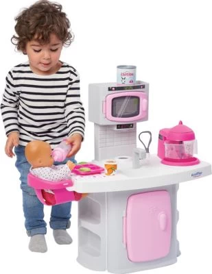 Diese tolle Babyküche aus dem Hause écoiffier eignet sich klasse als Geschenk für alle kleinen Puppeneltern! Die Spielküche ist mit einer Mikrowelle, einer Küchenmaschine, einem Kühlschrank und einer Spüle ausgestattet, sodass Kinder sich über realistischen Spielspaß freuen können. Die Lieblingspuppe kann sogar in dem integrierten Puppensitz sitzen! Auch ein Teller mit zwei Löffelchen, ein Fläschchen, eine Dose Babybrei und Milchpulver sind hier mit dabei.