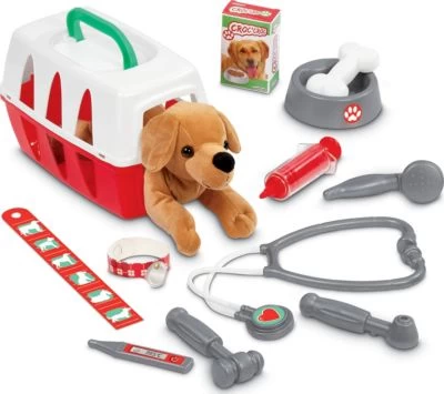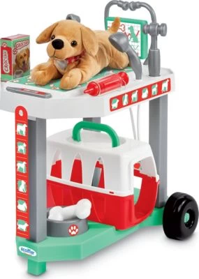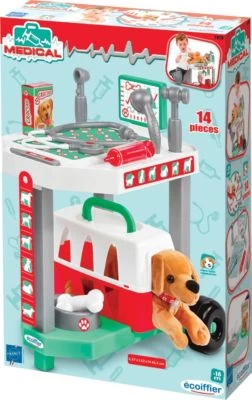 Wenn die liebsten Kuscheltiere krank sind, müssen sie schnell untersucht und versorgt werden! Wie gut, dass die écoiffier Tierklinik schon bereitsteht. Hier können Kinder ihre kleinen Lieblinge auf dem Untersuchungstisch untersuchen und versorgen. Vor einer Operation kann das Tier in der Badewanne unter der Abdeckung gewaschen und nach der OP mit der Transportbox wieder abgeholt werden. Das Tierärzt*innen-Set besteht aus einem Untersuchungswagen, einem Tragekorb, einem Fressnapf und verschiedenen medizinischen Utensilien wie Spritze, Hammer, Stethoskop, Duschbrause und Fieberthermometer. Mit dabei ist der niedliche, kuschelweiche Plüschhund. Dank der praktischen Rollen lässt sich der wendige Klinikwagen kinderleicht hin- und herschieben. Die einzelnen Zubehörteile sind besonders griffig und haben keinerlei scharfe Kanten, sodass sie besonders sicher für kleine Kinder sind.