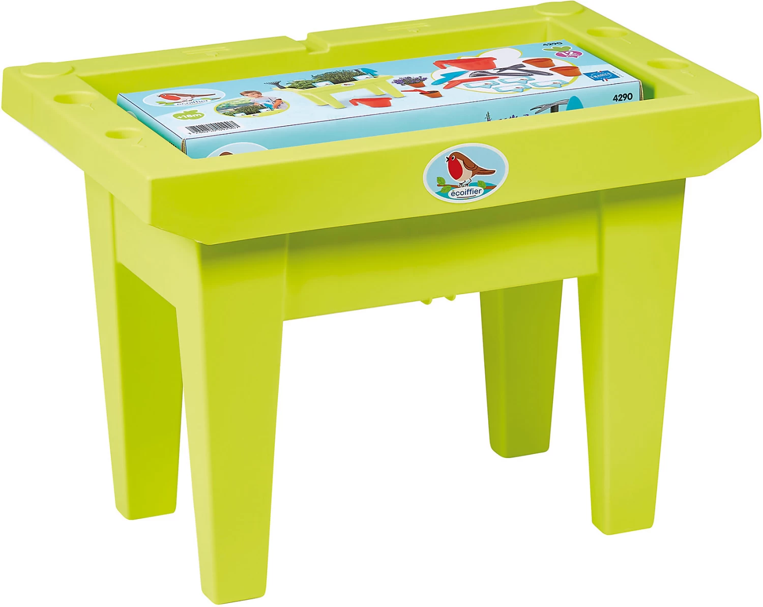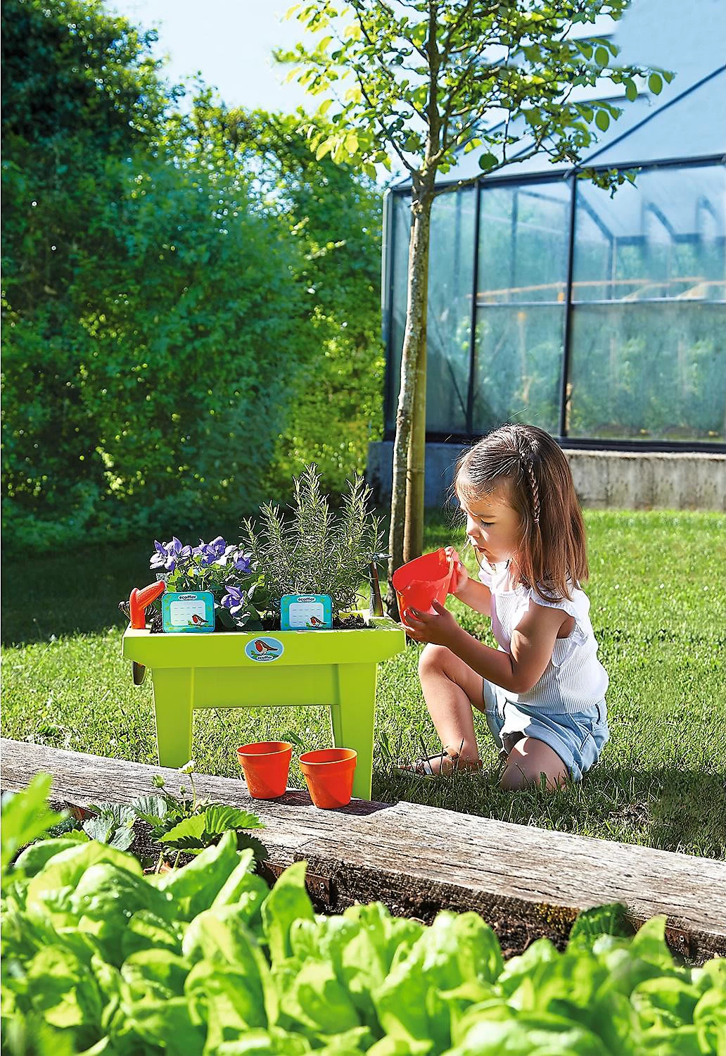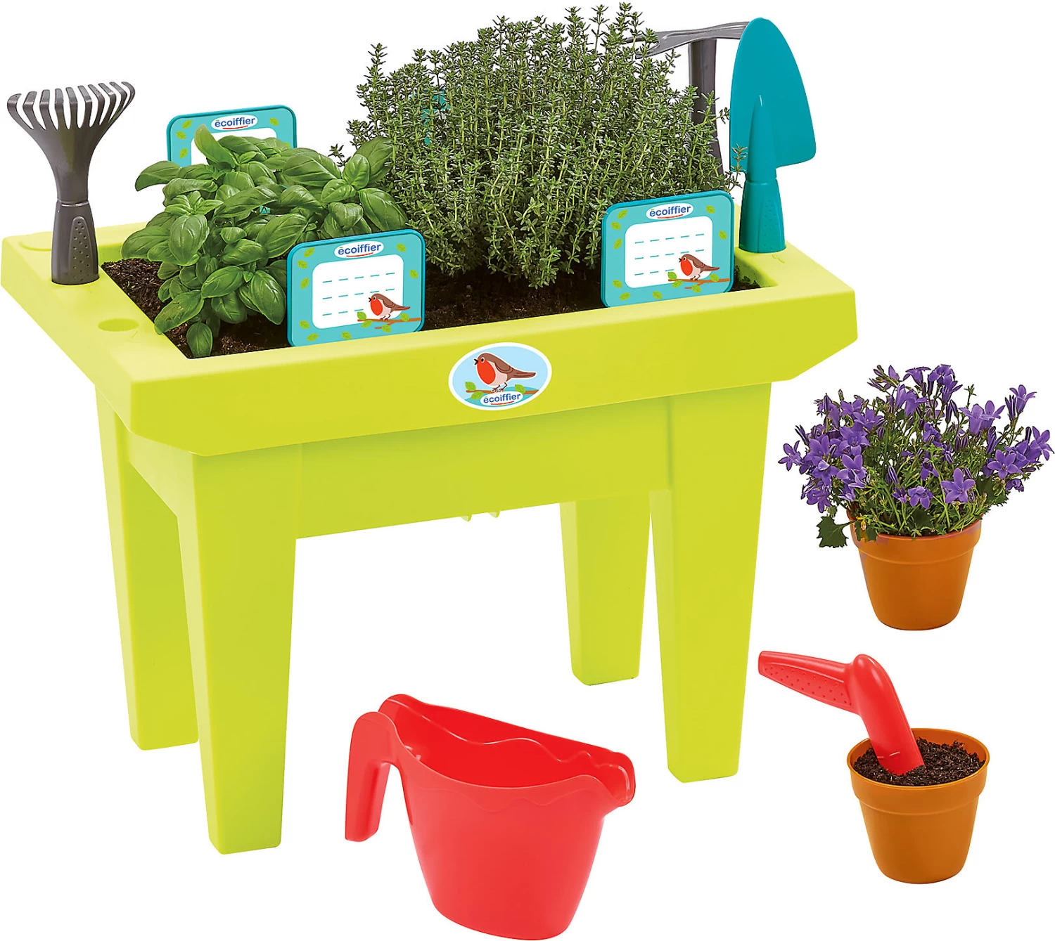 Gestalte deinen eigenen kleinen Garten! Mit dem Ecoiffier Hochbeet Gärtner*innenset kein Problem! Hier finden die Kids alles, was sie zum Gärtnern benötigen. Dank der kompakten Maße ist das Beet nicht nur für den Garten, sondern auch für Terrasse und Balkon bestens geeignet. In dem Hochgefäß auf vier stabilen Beinen haben mehrere Pflanzen Platz, egal ob Kräuter oder Blumen. Aufgrund der kindgerechten Höhe lassen sich diese mühelos einpflanzen und pflegen. Die mitgelieferten Gartengeräte eignen sich perfekt für eine Vielzahl von Aufgaben wie Graben, Jäten, Lockerung des Bodens und dem Pflanzen von Setzlingen. Vier beschreibbare Schilder erleichtern die Zuordnung der Pflanzen oder geben wichtige Tipps rund um die Pflege und die beiden Blumentöpfe können separat gestellt werden. Mit der Gießkanne können die kleinen Gartenfans alle Schützlinge mit Wasser versorgen. Viele Zubehörteile wie Handrechen und Schaufel, Hacke, Pflanzer, Gießkanne, vier Schilder und zwei Blumentöpfe sind dabei. Alle Teile sind schön groß, griffig und ohne scharfe Kanten und daher perfekt auch für kleinere Kinderhände geeignet. Das Hochbeet ist wasserdicht geschlossen, ein Wasserablauf kann selbst hineingebohrt werden.