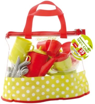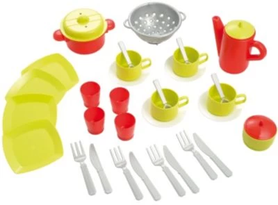 + 35 Teile: 4 Teller, 4 Becher, 4 Tassen, 4 Untertassen, 4 Löffel, 4 Gabeln, 4 Messer, 1 Kanne mit 1 Deckel, 1 Dose mit 1 Deckel, 1 Topf mit 1 Deckel, 1 Sieb
