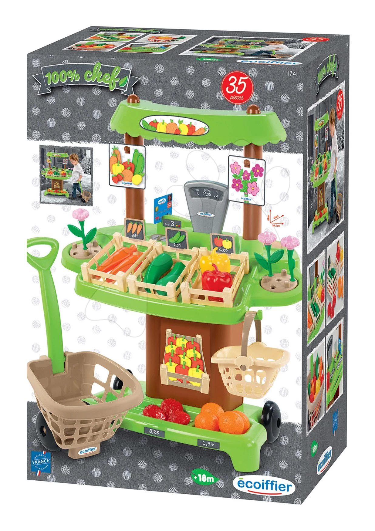 ECOIFFIER Spielküchenset Mit Pizza Und Eis Pizzeria Écoiffier Doppelseitig Mit Bio-Gemüseständer Und Bio-Organic 100%-Wagen