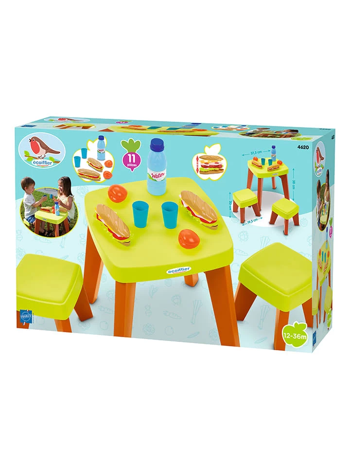 – Inhalt: 1 Picknicktisch, 2 Hocker, 2 Früchte, 2 Sandwiches, 2 Becher, 1 Flasche Wasser